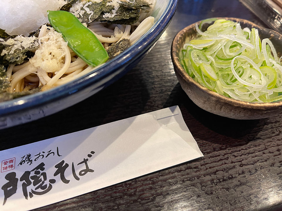 商標登録もされている名物メニュー「磯おろし」。創業当時では珍しい深夜営業など従業員も日々忙しい中、とにかく早く色々な物が食べられるものをというまかないメニューがお客様の提案によって商品化。戸隠そばの名物メニューが誕生したのです。大根おろし、ショウガ、きぬさや、海苔、揚げ玉のぶっかけそば(税込み850円)。